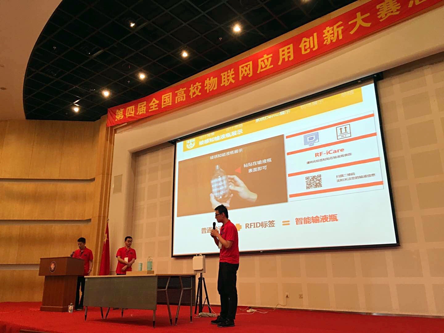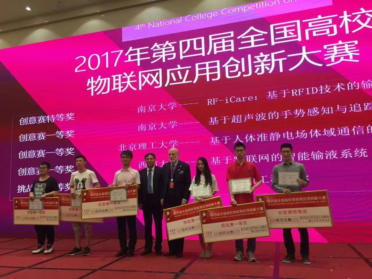 2017年5月12 – 14日,由教育部科技发展中心主办的第四届全国高校物联网应用创新大赛创意赛全国总决赛在东华大学图文信息大楼第一报告厅成功举办。我系分布式计算团队(成员:何兵兵,张柯岩,陆逸嘉;指导教师:谢磊)凭借“RF-iCare:基于RFID技术的输液监测系统”,从全国七大赛区1050只队伍中脱颖而出,获得第1名的优异成绩,夺得创意赛全国特等奖。我系团队(成员:孙珂、凌康;指导教师:戴海鹏)凭借“基于超声波的手势感知与追踪”的项目夺得总决赛第2名和一等奖(其中特等奖一名,一等奖三名,二等奖六名)。谢磊和戴海鹏作为团队指导教师分别获得最佳指导教师奖。在ACM图灵奖五十年中国大会的庆功晚宴暨赛事颁奖典礼上,图灵奖获得者、互联网之父Vinton Cerf和教育部科技发展中心李志民主任参与颁奖典礼,并颁发特等奖和最佳指导老师奖奖牌。出席者还包括图灵奖获得者John Hopcroft,ACM主席Vicki Hanson,ACM Fellow、IEEE Fellow、清华大学软件学院院长刘云浩等。此次总决赛的参赛队伍共有从七大赛区选拔出来的包括成人小说 、清华大学、武汉大学、哈尔滨工业大学、华中科技大学、西安交通大学等在内的42所高校75支参赛队伍。