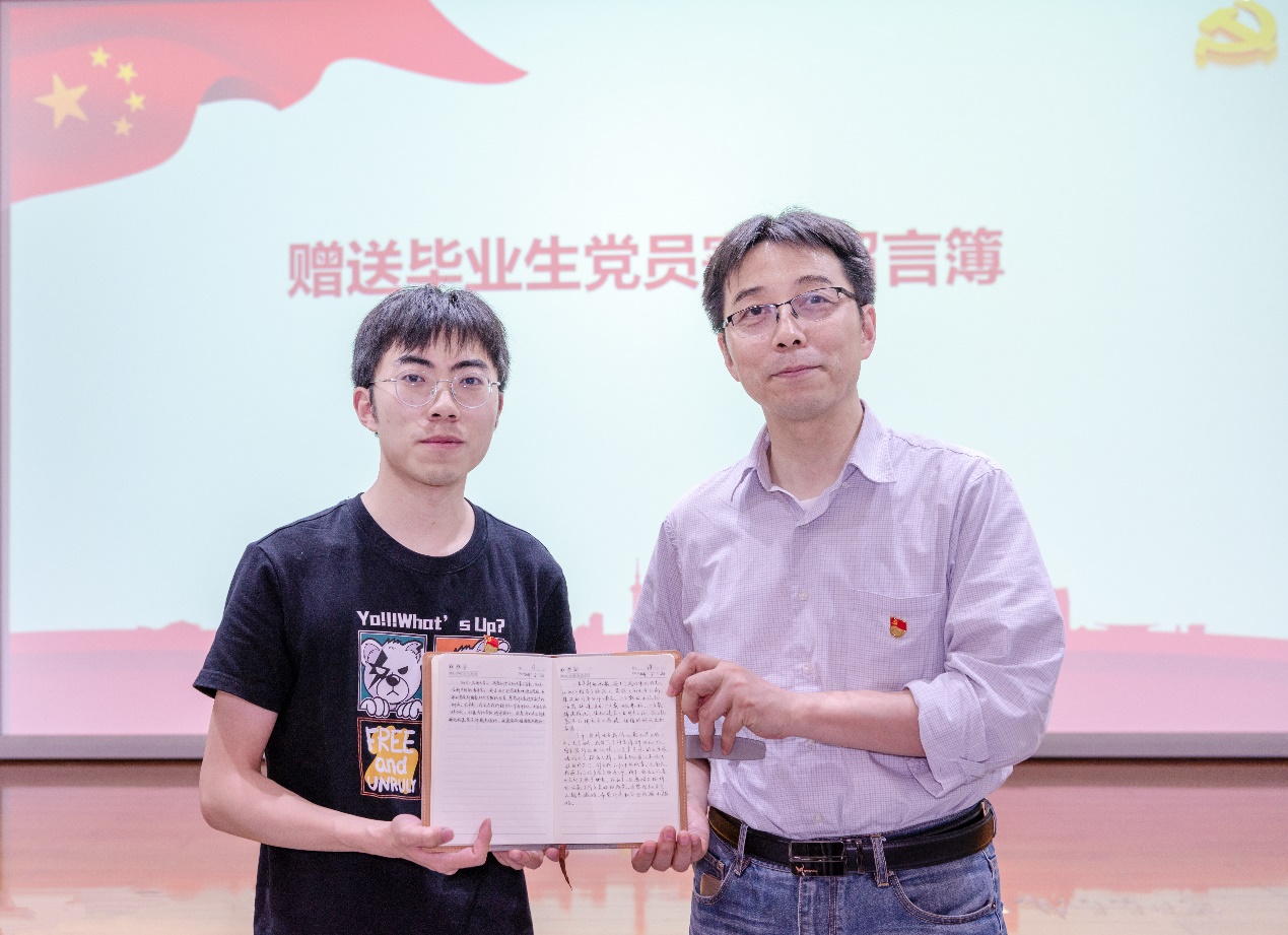 活动第三环节,计算机系本科生党支部向院系党委建言献策,赠送寄语留言簿;黄凯鑫代表全体本科毕业生党员作出郑重承诺,将努力践行“诚朴雄伟 励学敦行”校训,发挥榜样作用,文明光荣离校,保持终身学习,在各自岗位“嚼得菜根 做得大事”,不忘母校教育,不断追求卓越,勇攀高峰。
