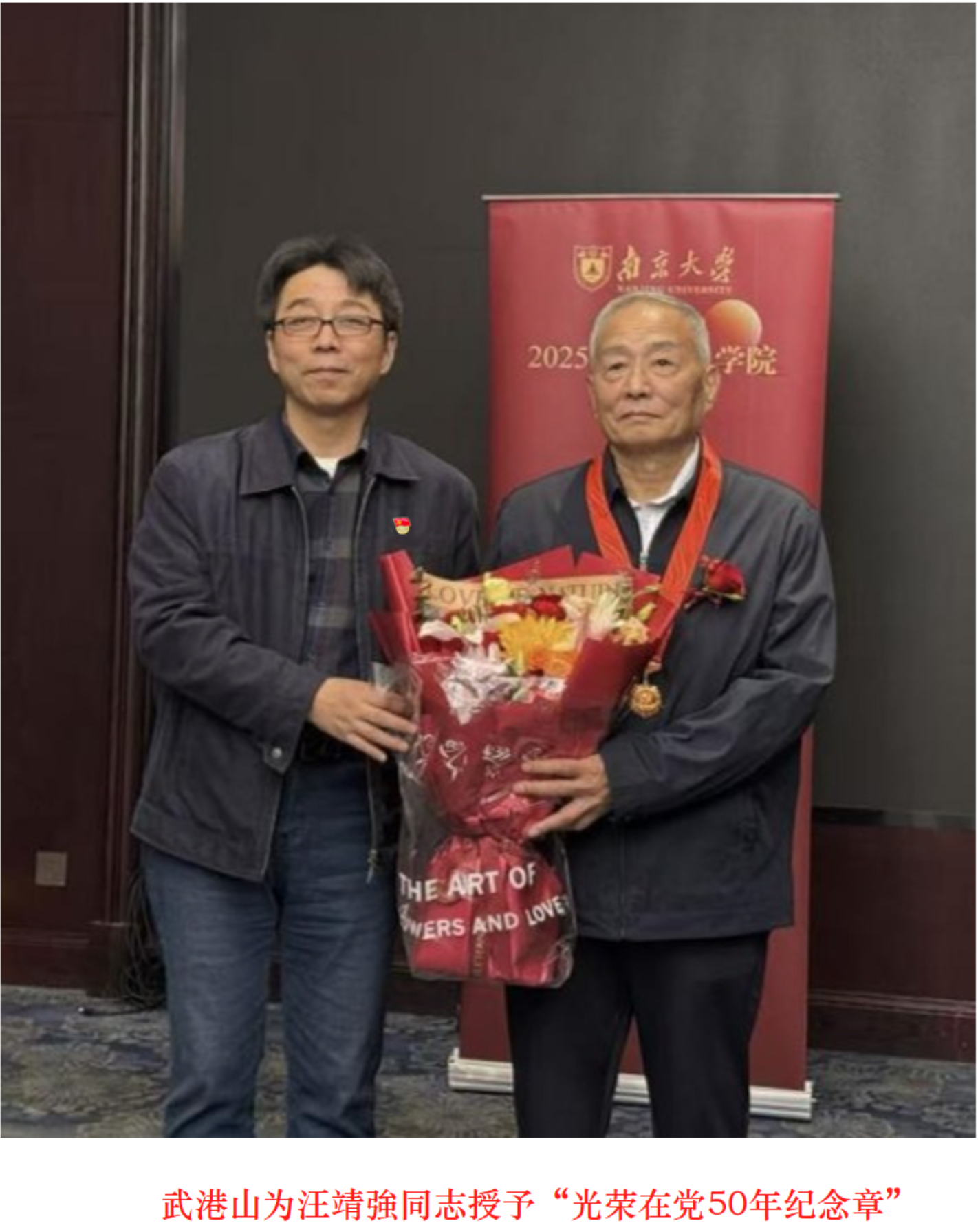 今年,我们迎来中华人民共和国成立76周年与中国共产党建党104周年的双重荣光。在这意义非凡的年份里,成人小说 退休教师党支部再传喜讯——老党员汪靖強同志党龄已满五十载,达到“光荣在党50年”纪念章的授予标准。为向老党员的忠诚坚守致以崇高礼赞,学院党委特意将纪念章授予仪式安排在老同志集会的庄严时刻。一枚熠熠生辉的纪念章,承载着党组织对老党员半个世纪初心不改、默默奉献的高度肯定,也让这场集会成为一堂生动的党性教育课,在传承红色基因中凝聚起奋进力量。