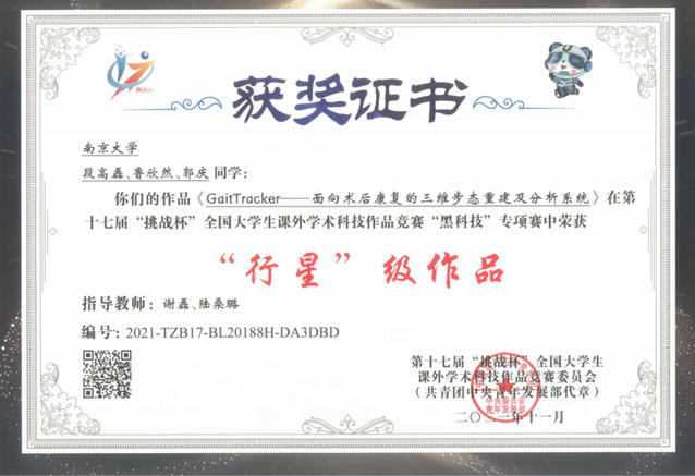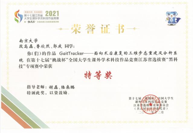 GaitTracker步态分析系统经过我系谢磊教授、陆桑璐教授的悉心指导,由计算机系学子独立设计完成,并不断进行系统的迭代优化,此前凭借创新型的平台已斩获多项系统类的荣誉:在2021年第十七届挑战杯全国大学生课外学术科技作品竞赛过程中,取得黑科技专项赛国赛行星级作品、江苏省赛特等奖;2021年中国高校计算机大赛-网络技术挑战赛华东赛区一等奖。