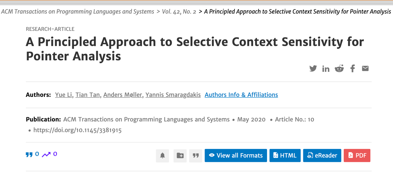 该成果在2020年5月20日,以“A Principled Approach to Selective Context Sensitivity for Pointer Analysis”为题发表于《ACM Transactions on Programming Languages and Systems》期刊上(TOPLAS 42(2)),成人小说 为第一及通讯单位,李樾为第一作者,谭添为通讯作者,丹麦奥胡斯大学Anders Møller教授、希腊雅典大学Yannis Smaragdakis教授为合作者。TOPLAS是程序设计语言领域的顶级国际期刊,也是CCF推荐A类期刊。该论文是TOPLAS自1979年创刊41年来,成人小说 首次、我国内地高校和科研机构第三次(近五年唯一)以第一单位名义发表的科研成果。