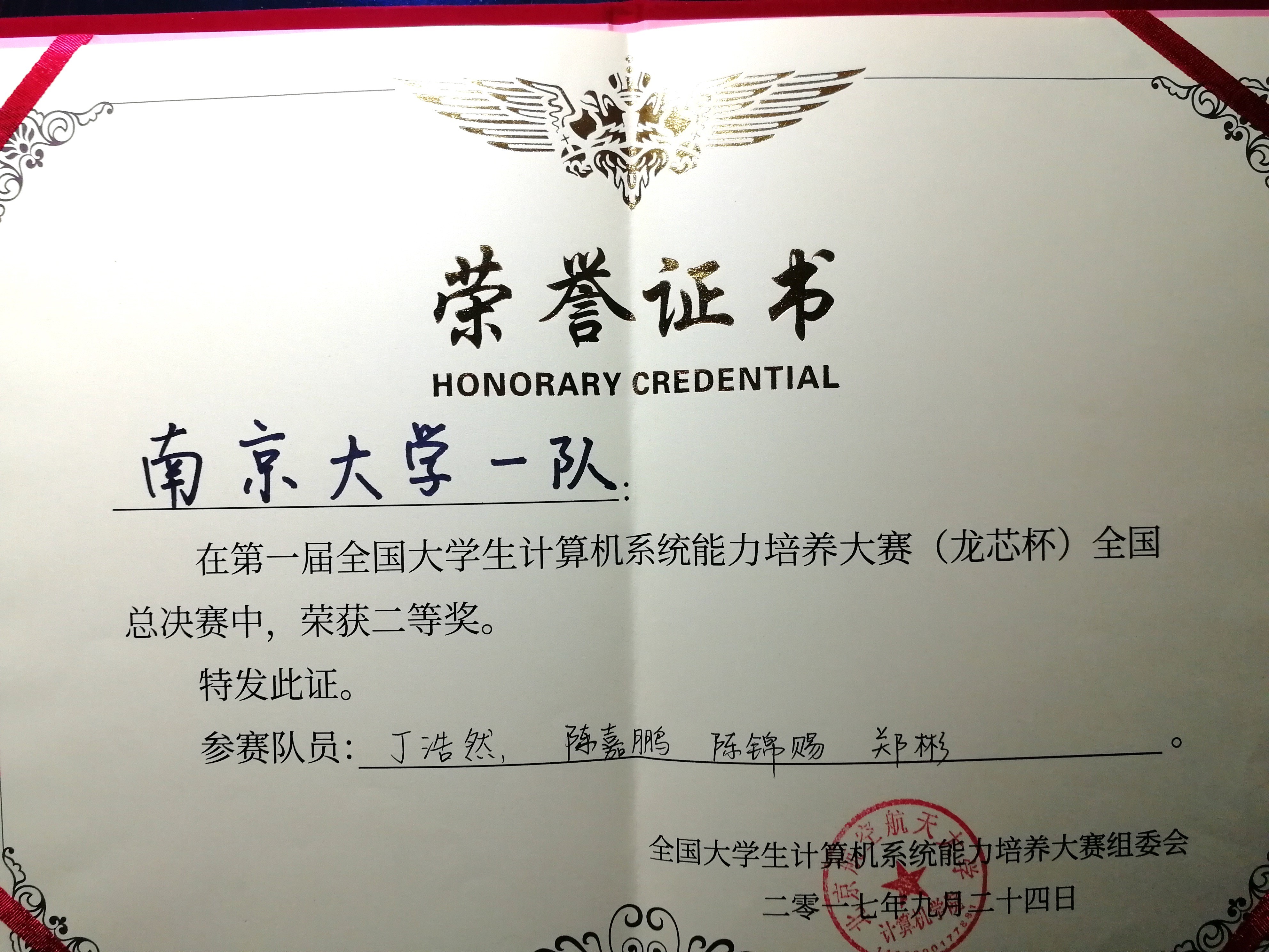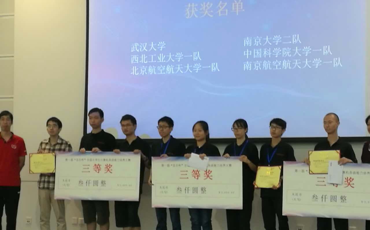 我系参赛(一)队由丁浩然、陈嘉鹏、陈锦赐、郑彬四位同学组成,参赛(二)队由刘博、欧先飞、田永畅、李洲四位同学组成,李俊老师和蒋炎岩博士任指导教师。我系两个队的参赛作品是在自行设计的CPU上运行自行开发的操作系统,并在其上运行仙剑和超级玛丽等游戏程序,作品展现出了南大计算机系本科生具有非常扎实的计算机系统综合设计能力。