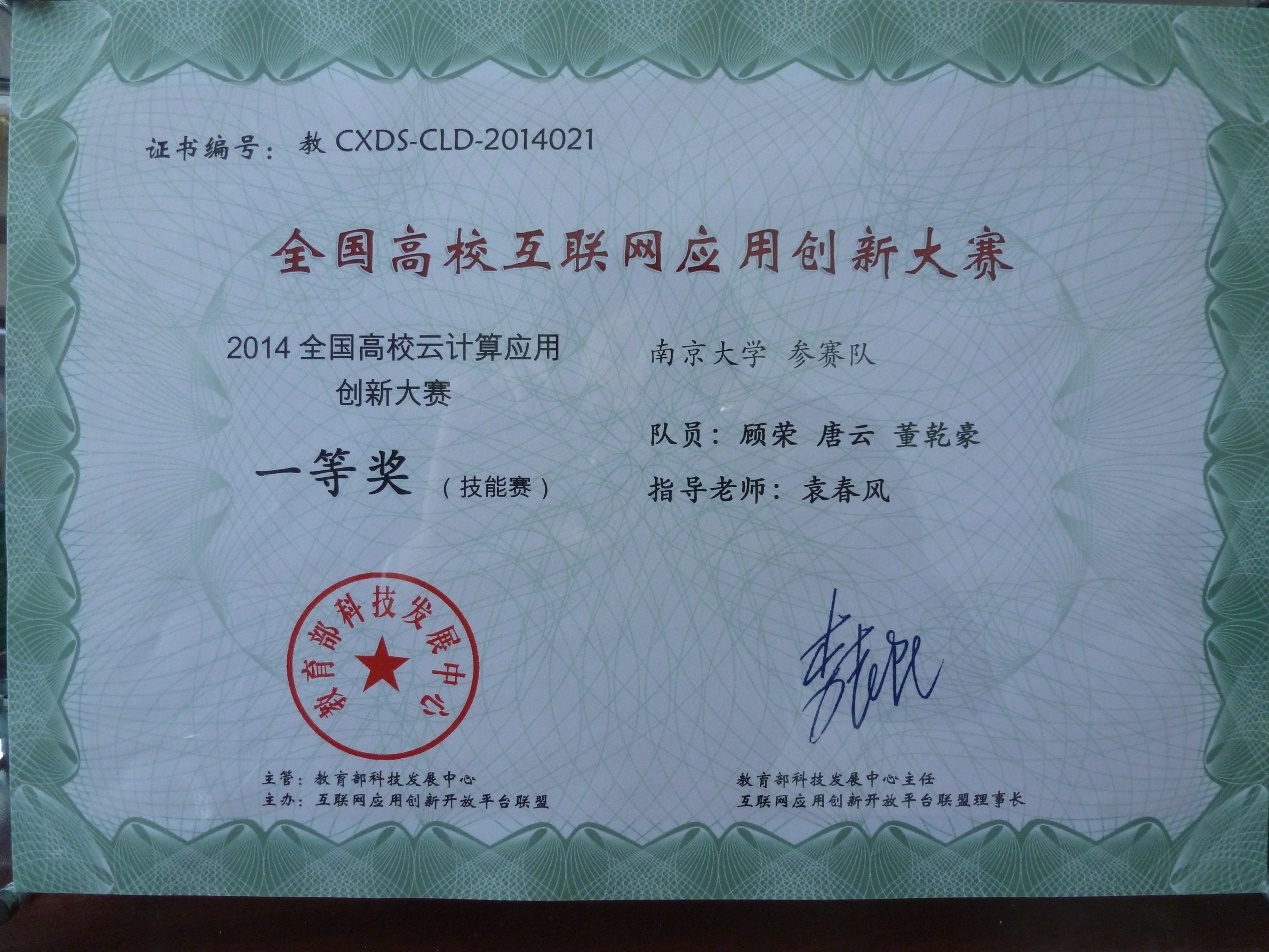 第一届“全国高校云计算应用创新大赛”经过半年多的赛程,于2015年4月22日在东南大学落下帷幕。我系PASA大数据实验室由顾荣、唐云和董乾豪三位同学组建、袁春风老师指导的NJU-PASA队,经过预赛、复赛和总决赛三轮角逐,最终脱颖而出,在全国500多支参赛队伍中,获得技能赛第1名的优异成绩,荣获大赛一等奖! 本次全国高校云计算应用创新大赛是面向全国高校开展的云计算和大数据竞赛活动,由教育部科技发展中心和中国互联网应用创新开放平台联盟主办、东南大学计算机科学与工程学院承办(大赛链接://cloud.seu.edu.cn/contest/index)。大赛自2014年10月正式启动,设置了技能赛、命题赛和创意赛三种竞赛项目,并分为预赛、复赛和总决赛三个阶段,持续进行了为期半年多的赛程。大赛覆盖院校广,共有来自全国东北、华北、华东、华中、华南、西北、西南7个赛区、共147所高校的近500支队伍报名参赛,经过预赛阶段的激烈角逐,最终全国共有42支队伍进入复赛。2015年4月21日,大赛三个竞赛项目的所有决赛队伍会师东南大学,进行了最后的总决赛答辩。经过预赛、复赛和总决赛三个阶段的角逐,大赛三个竞赛项目共决出特等奖1名,一等奖4名,二等奖10名,三等奖18名。 本次大赛的技能赛项目赛题内容是大数据分析与算法设计,共设置了4道基于Hadoop和Spark的大数据分析与算法设计赛题。在全国范围内共有212支队伍报名参加了技能赛。经过预赛阶段的角逐,全国各赛区最终有12支队伍进入技能赛全国总决赛。总决赛阶段,在综合预赛和复赛比赛结果以及决赛现场答辩成绩的基础上,最终决出了技能赛12支决赛队伍的名次,并决出一等奖1名,二等奖3名,三等奖5名,其中,我系顾荣、唐云和董乾豪三位同学组成的NJU-PASA队位列12支决赛队伍之首,摘得技能赛桂冠,荣获大赛一等奖。 此外,我系由由孔繁宇、温开源、邱维民、朱浩仁四位同学组建、钱柱中老师指导的队伍获得云计算命题赛三等奖。