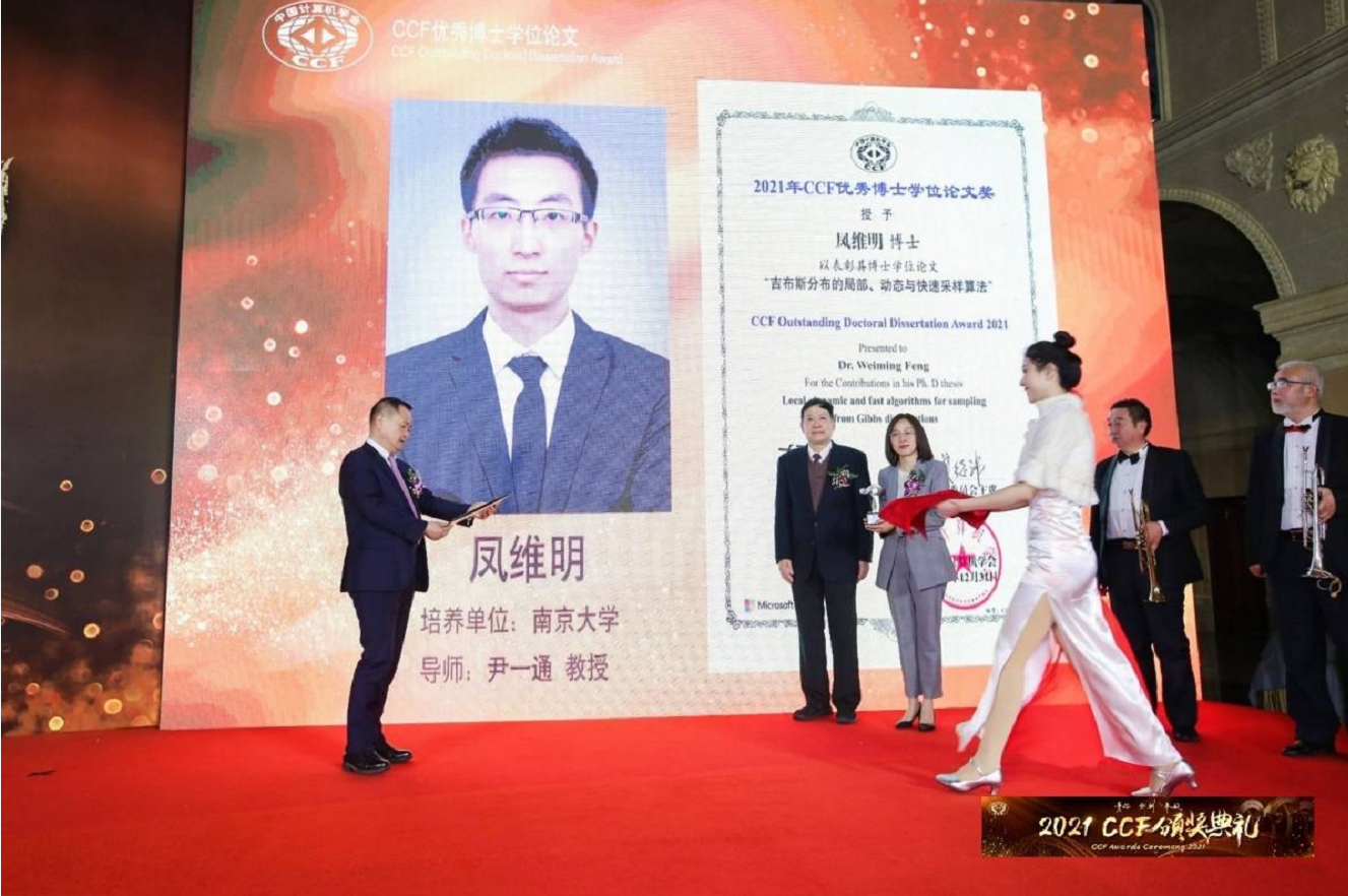 计算机科学与技术系博士研究生凤维明(指导教师:尹一通)的博士学位论文《吉布斯分布的局部、动态与快速采样算法》、博士研究生叶翰嘉(指导教师:姜远)的博士学位论文《开放环境下的度量学习研究》获此殊荣。该奖自设立之初就得到了微软亚洲研究院的大力支持和经费赞助。CCF理事长梅宏教授、奖励委员会主席钱德沛教授、微软亚洲研究院学术合作总监马歆女士共同为获奖者颁发了奖杯和证书。