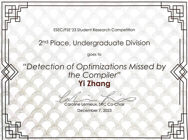 张弋同学针对编译器优化遗漏问题,提出了一种基于编译器优化一致性的优化遗漏检测方法。经过对LLVM的测试,检测出5类可用表达式(Available Expression)的优化遗漏问题。该项工作以“Detection of Optimizations Missed by the Compiler”为题参加FSE 2023 SRC,荣获本科生组二等奖。