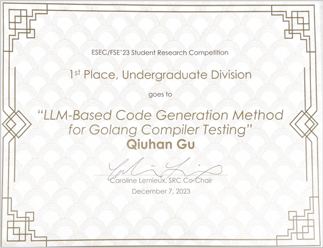顾秋涵同学针对编译器模糊测试的生成代码质量低、覆盖率不足的问题,提出了基于大模型的测试代码生成和基于生成代码的编译器测试方法。在针对Go编译器的测试中发现,该方法能够避免生成包含未定义行为或存在语法错误的代码,并且相比于传统模糊测试方法取得了更高的测试覆盖率。该项工作以“LLM-Based Code Generation Method for Golang Compiler Testing”为题参加FSE 2023 SRC,荣获本科生组一等奖。